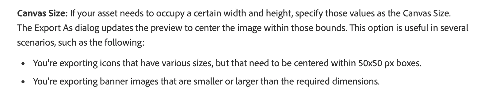We can not use the size of the canvas or art boards as suggested because the exports all need to have different sizes. Creating an artboard for each individual image would be crazy.