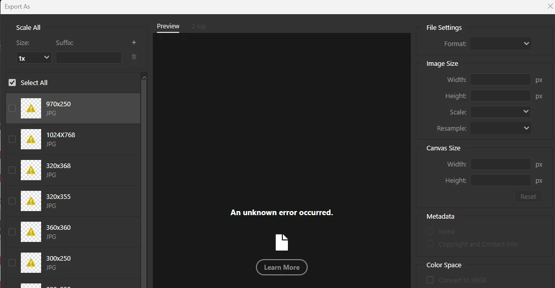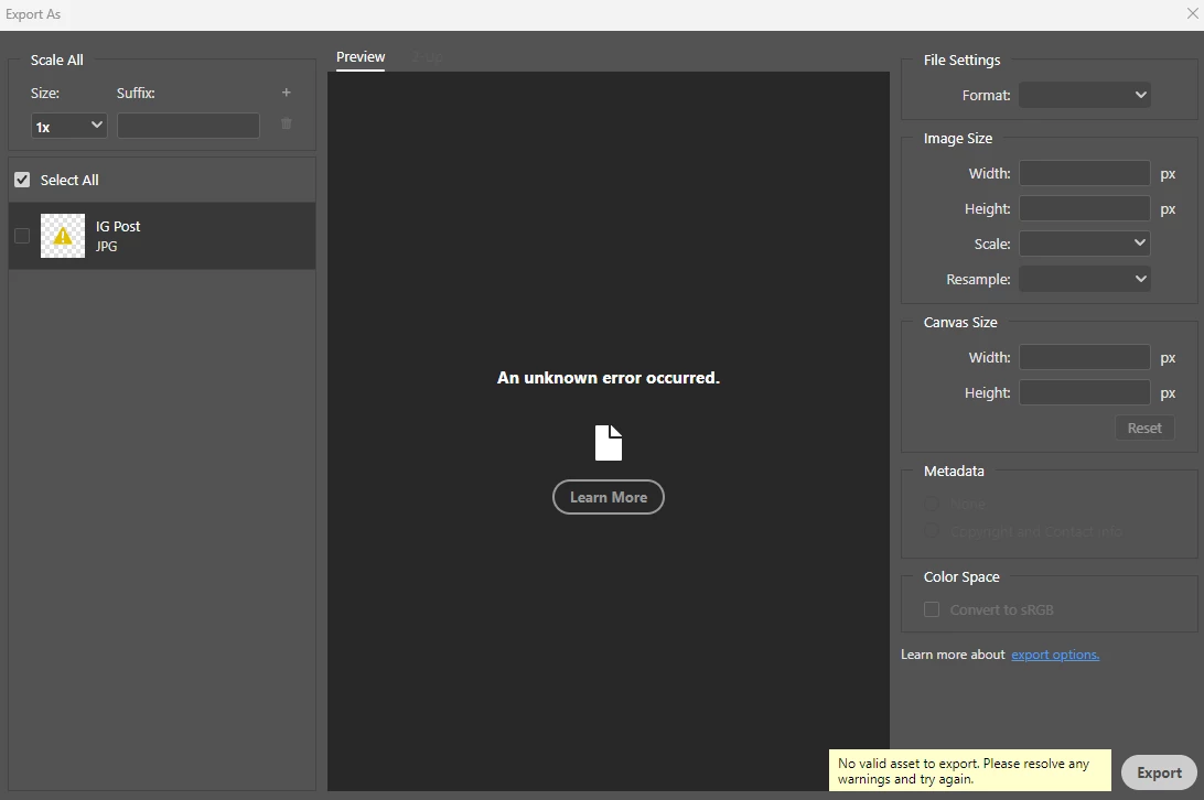 P: Photoshop 27.4 (GA) Export As says "An unknown error occurred."