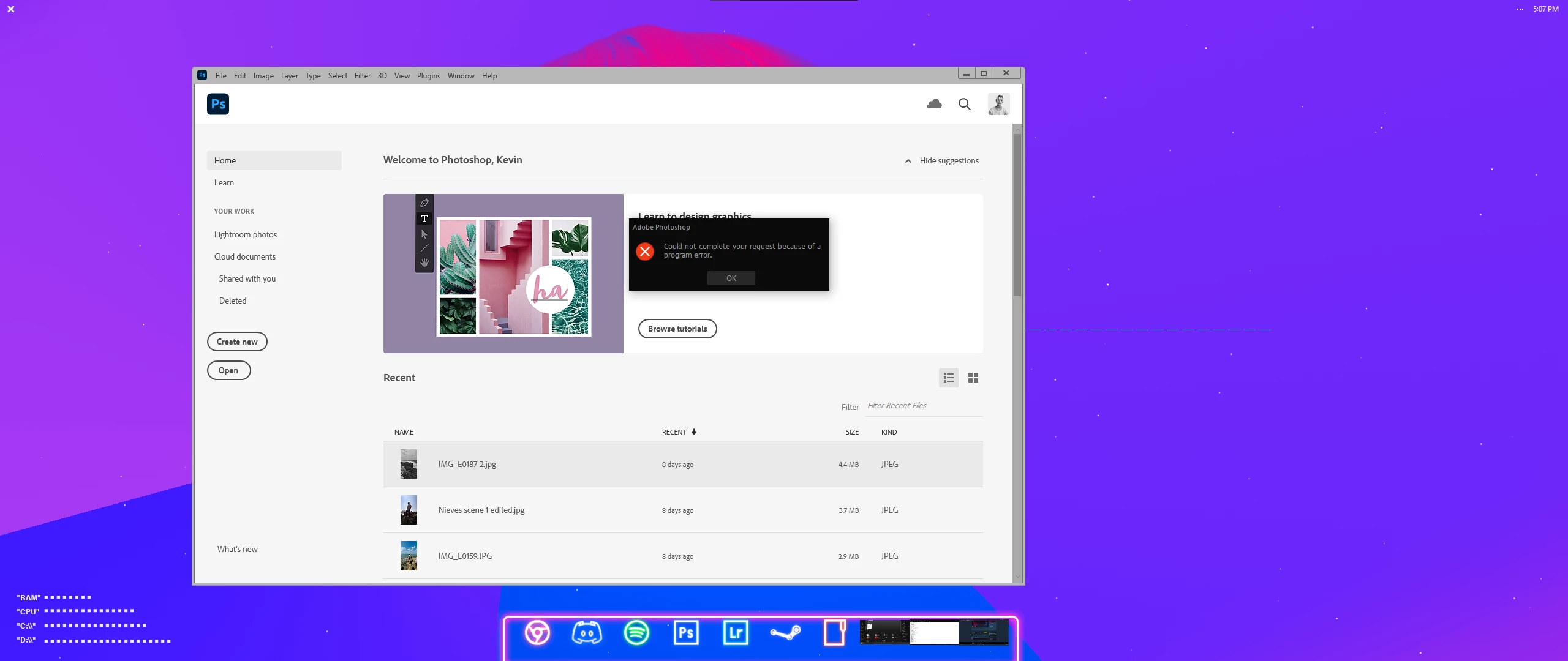 Every time I open photoshop and try to open a photo or create a new one it will say, "Could not complete your request because of a program error." I am on the latest version of photoshop and have tried restarting, resetting my preferences and reinstalling. Restarting does nothing and resetting my preferences and reinstalling only works for the first time I open it again. I am on windows 10.