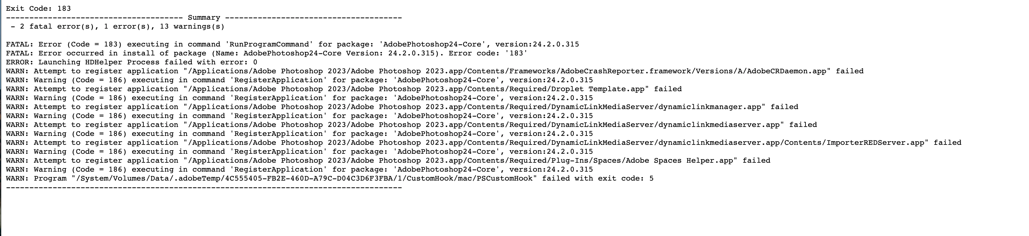 @Kevin Stohlmeyerin my case, i ran into the 183 error before and after doing a whole clean install of macOS Ventura 13.2.1. I didnt have ANY anti-virus software installed nor did i activate the firewall in network settings. actually, right after the initial setup up process, i instantly downloaded creative cloud and tried to install 14.2 photoshop. Therefore, i tried to isolate the problem as much as possible to avoid any software conflicts but still didnt work until i installed Rosetta 2 which a lot of users do not want to do.