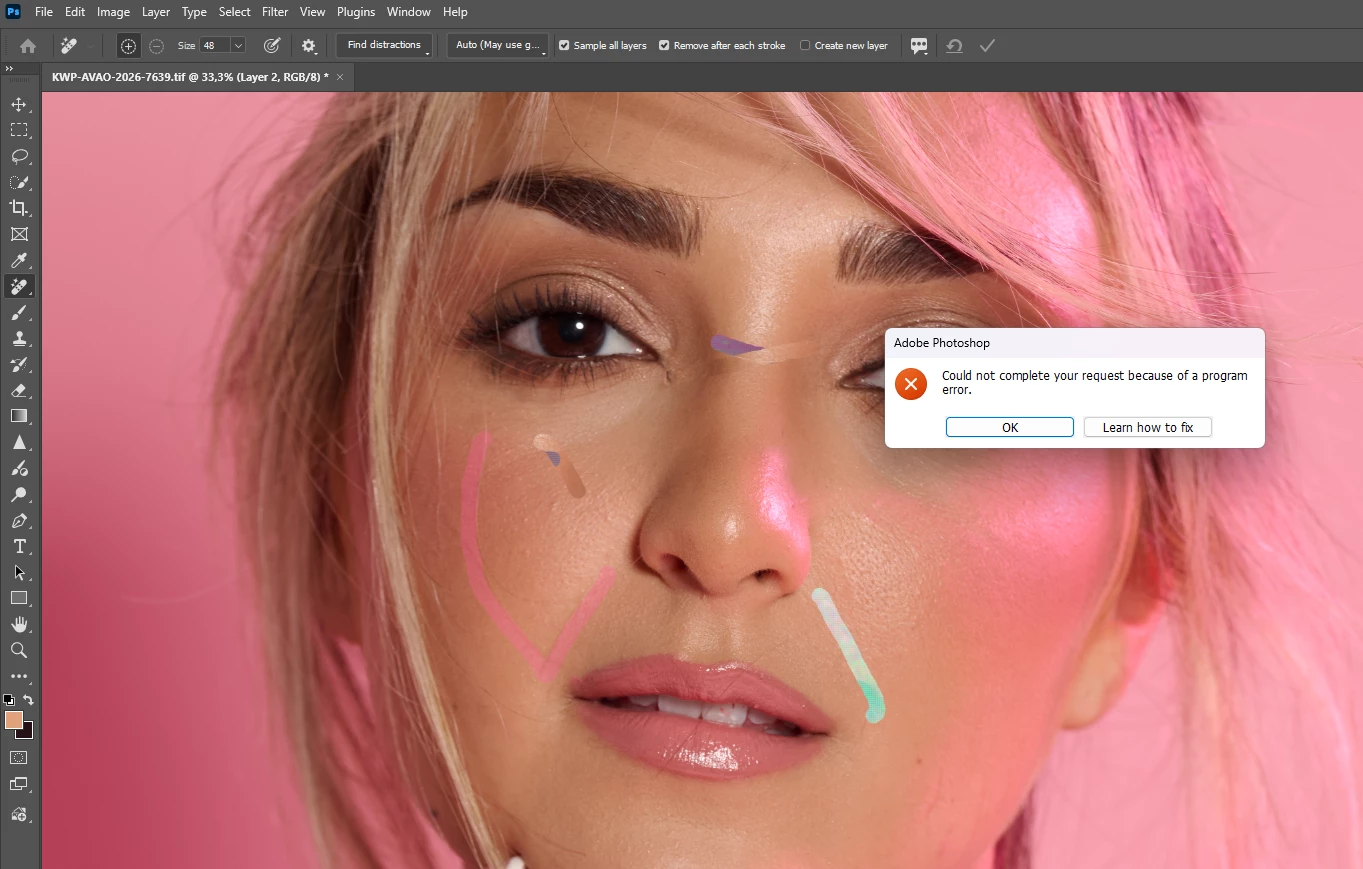 The AI ​​repair brush is not working in version 27.4. An error message appears when I set it to AI ON. When AI is set to AI AUTO, a pattern appears where the brush is supposed to repair.