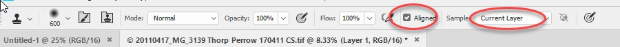 1. Set the clone tool to aligned and current layer