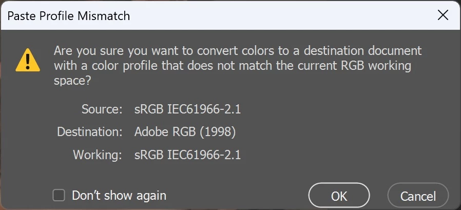 I'm trying to add a watermark, to a photo, as part of my business portfolio. When I get the 'Paste Profile Mismatch' error. I have another general watermark, which i can copy and paste onto images, which works fine. I was reading through another post, about the same error, someone asked about colour settings, I've posted the colour settings for logo and photo, they're identical.