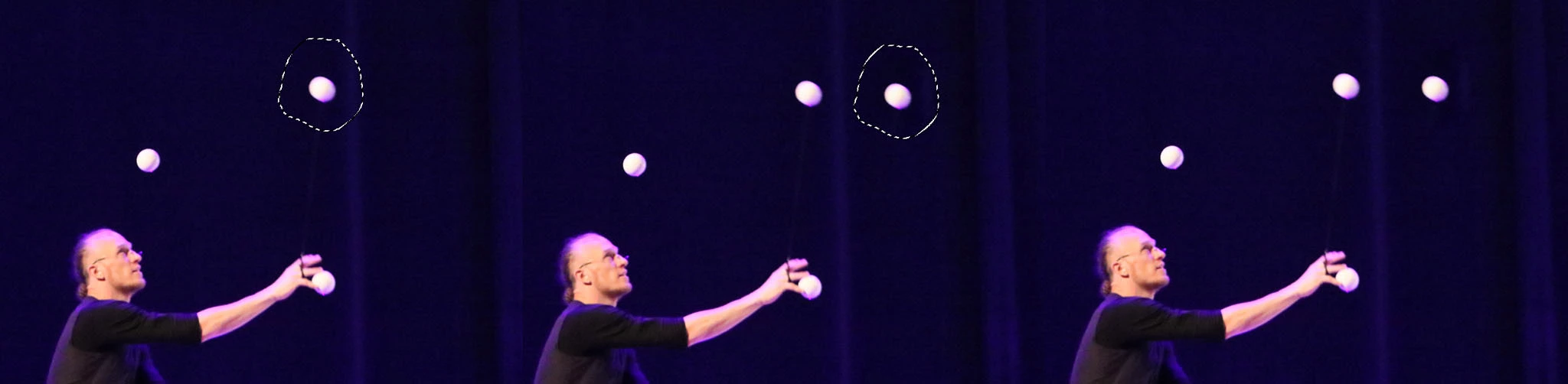 Here's an image with three screen shots combined illustrating the problem - The Patch Tool duplicates a juggler's ball instead of erasing it.