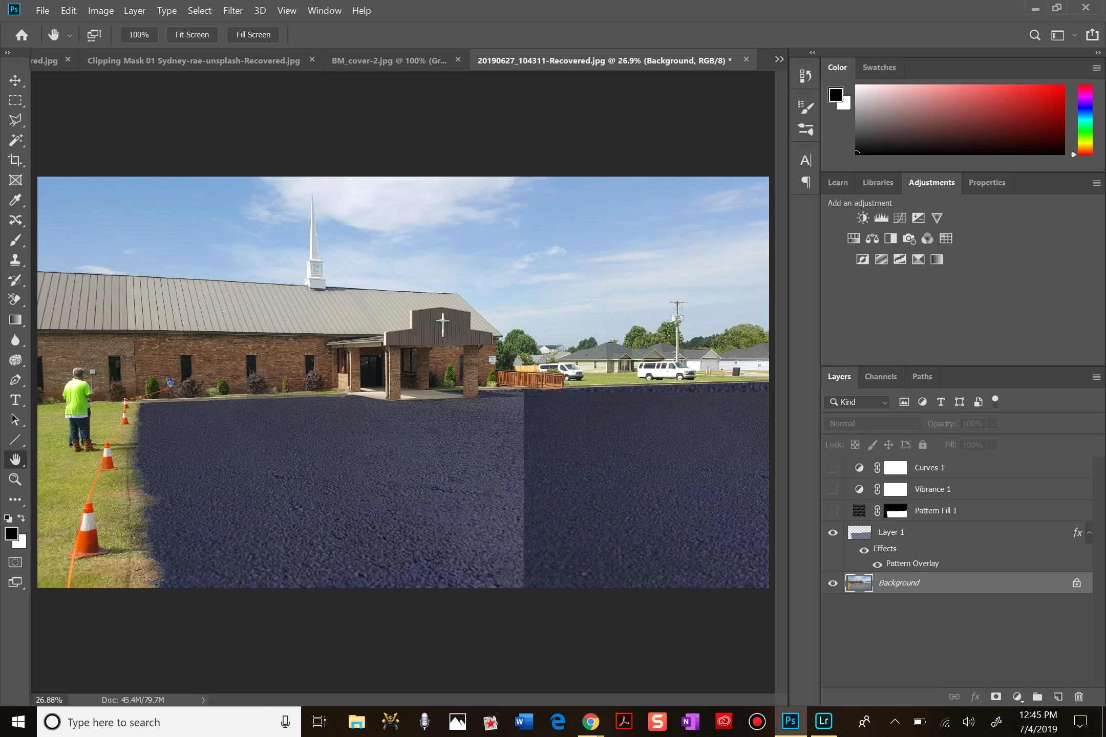 Hi, I am working with an image of a church and its parking lot. I have crudely selected the asphalt parking lot and created a layer for it using the pen tool. Using another image, I selected a piece of asphalt where the texture is appealing to me. I created a pattern texture and I am wanting to use it to transform the parking lot of the church. The goal is to place the pattern only over the layer for the parking lot I created and to make it blend with the rest of the photo in regards to the brightness and range of colors of the overall image.