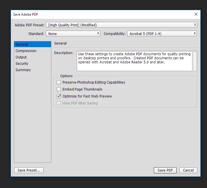 I've been using PS CC 2015 on my (Windows) work computer for some time now without issues, but after my Windows 10 updated itself overnight a few weeks back, my PDF save preferences keep changing to some whacky modified settings & I can't get them to go back to 'High Quality Print' as my default as I would like it to be. These weird settings (which I never used previously) will automatically add a white background to PDFs I save without layers & no background (which is most of the files I work with). For some reason I don't have this issue with PDFs with layers, only when I save without layers.