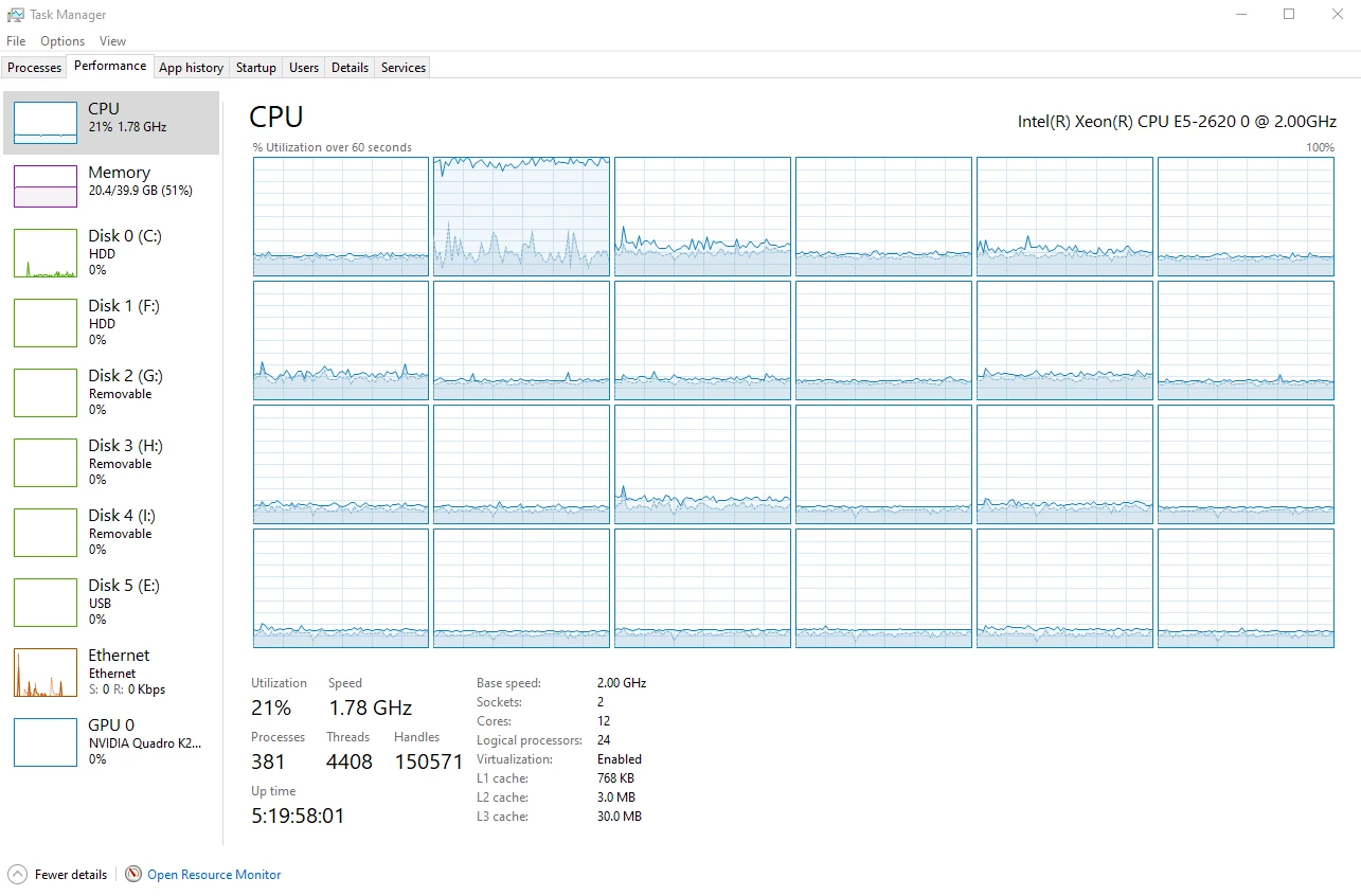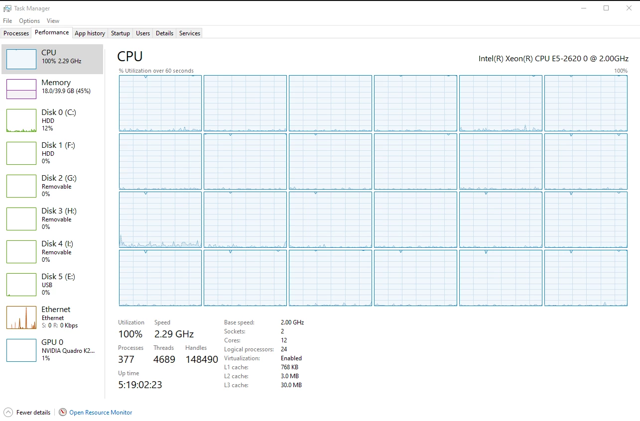 100% CPU, half memory utilized Photoshop can user 90%,  6% SSD Photoshop was using some scratch space. It took my machine 12+minuets to perform the surface blur,   All 24 core were flat lined.