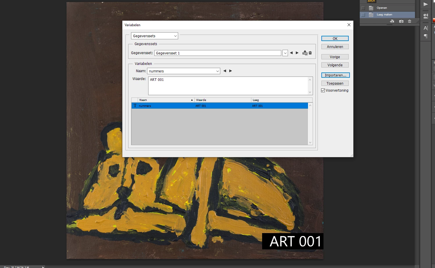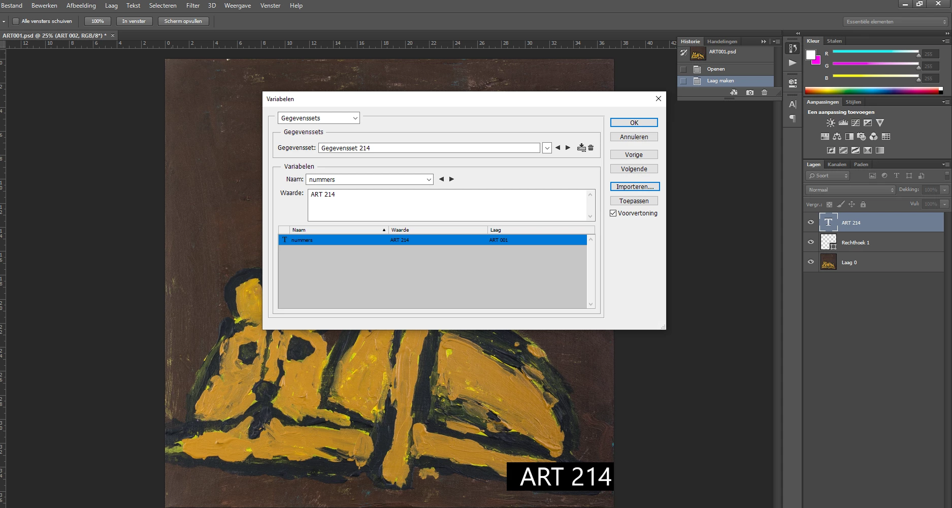 So i want to name difrent photo's with the correct data set so how do i do this for exemple in photo 1 is art 001 and in the second photo 214 needs to be another one that i have on my pc but idk how to tell photoshop to go trough the list of images i have. SO TO BE CLEAR ART 214 is an image from a cat for exemple a difrend image. (bcs it only aplies to this image and i want all mij 214 photo's to be with art"number" on