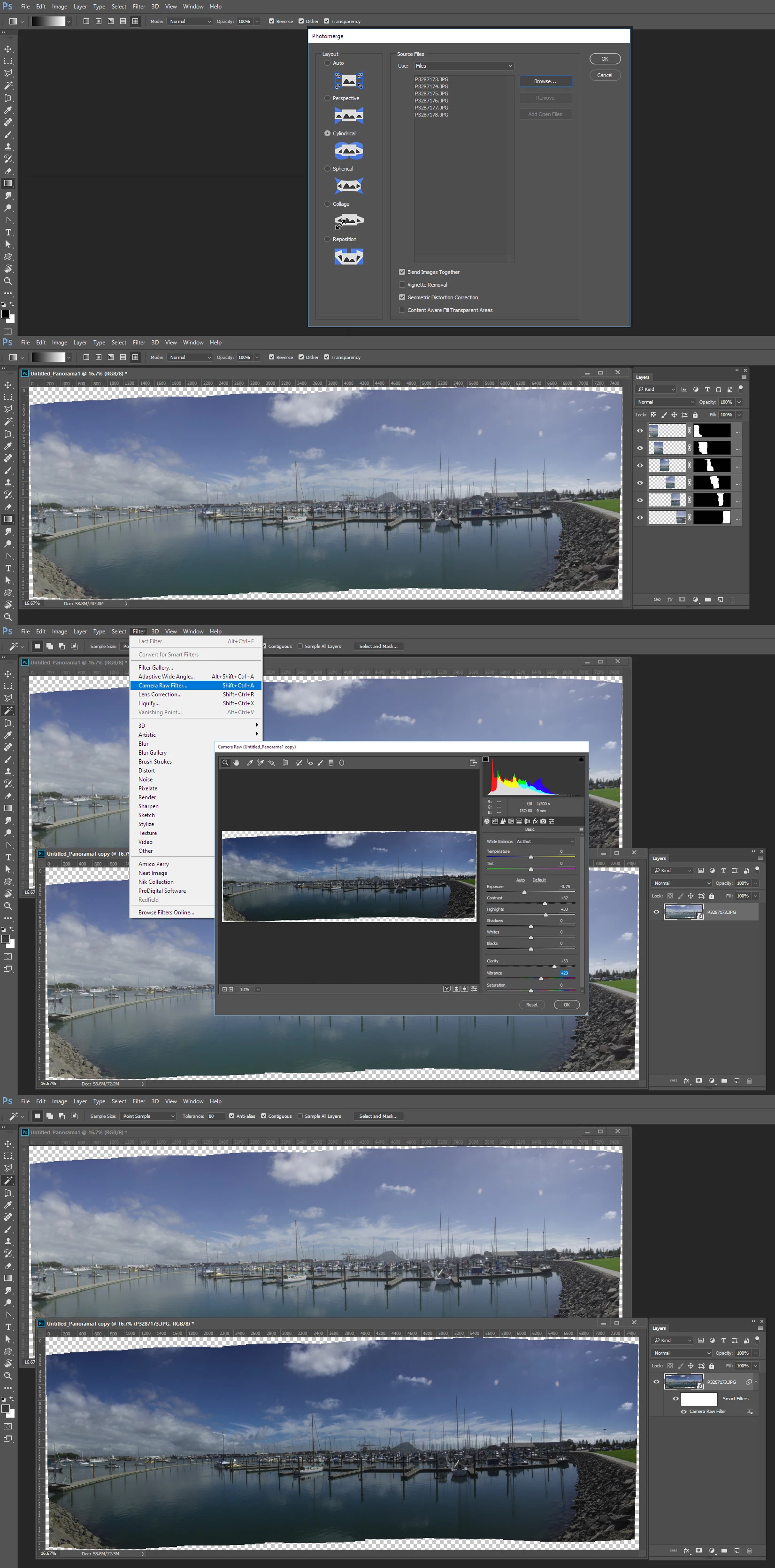 IMO When you use Photomerge you should not adjust the images used you should let Photomerge do its thing.
