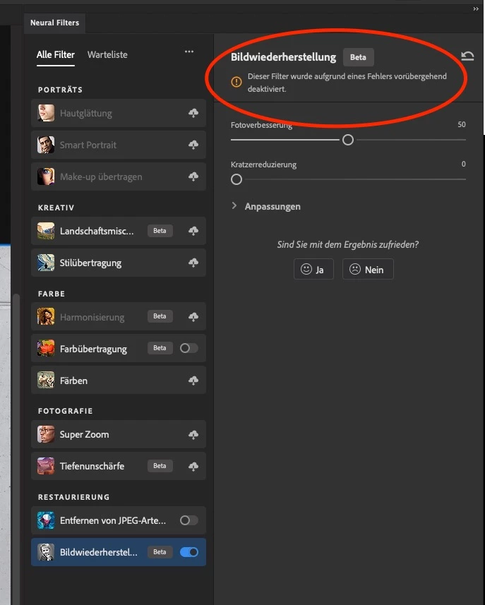 I've also tried applying the neural filter to a layer containing just the face, and a B&W conversion of that layer. Also no joy.