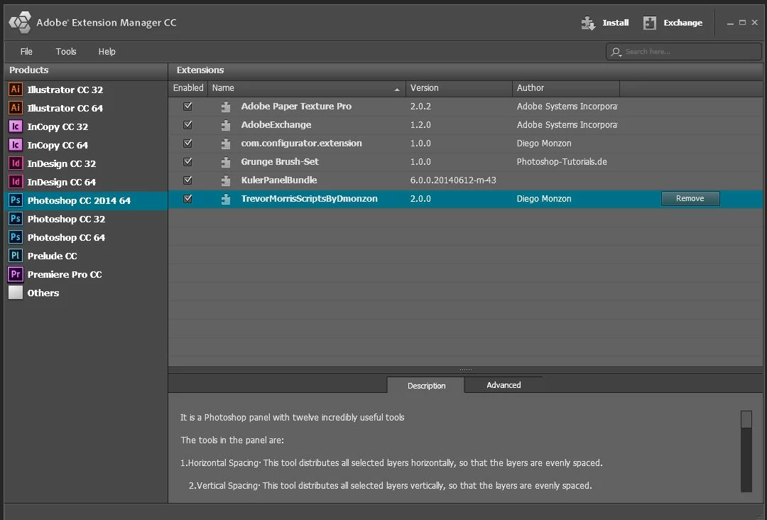 So who has got what working?  I eventually managed to get CC 2014 to appear in the Manage Extensions list after reinstalling the Extension manager, and you can see several Extensions are listed.  Dmonzon tools is there twice because I installed v2 to see if it would work with 2014.  It doesn't.  In fact the only one that appears in 2014 > Window > Extensions is Kuler.