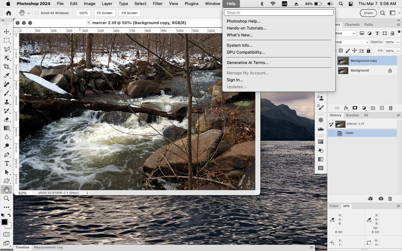 photoshop 2024 (25.0/25.5.1) Help menu after no sign in screens appears.