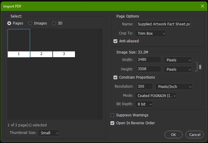 Nothing so complicated! Literally just drag and drop the PDF into Photoshop, then you get this dialogue box: