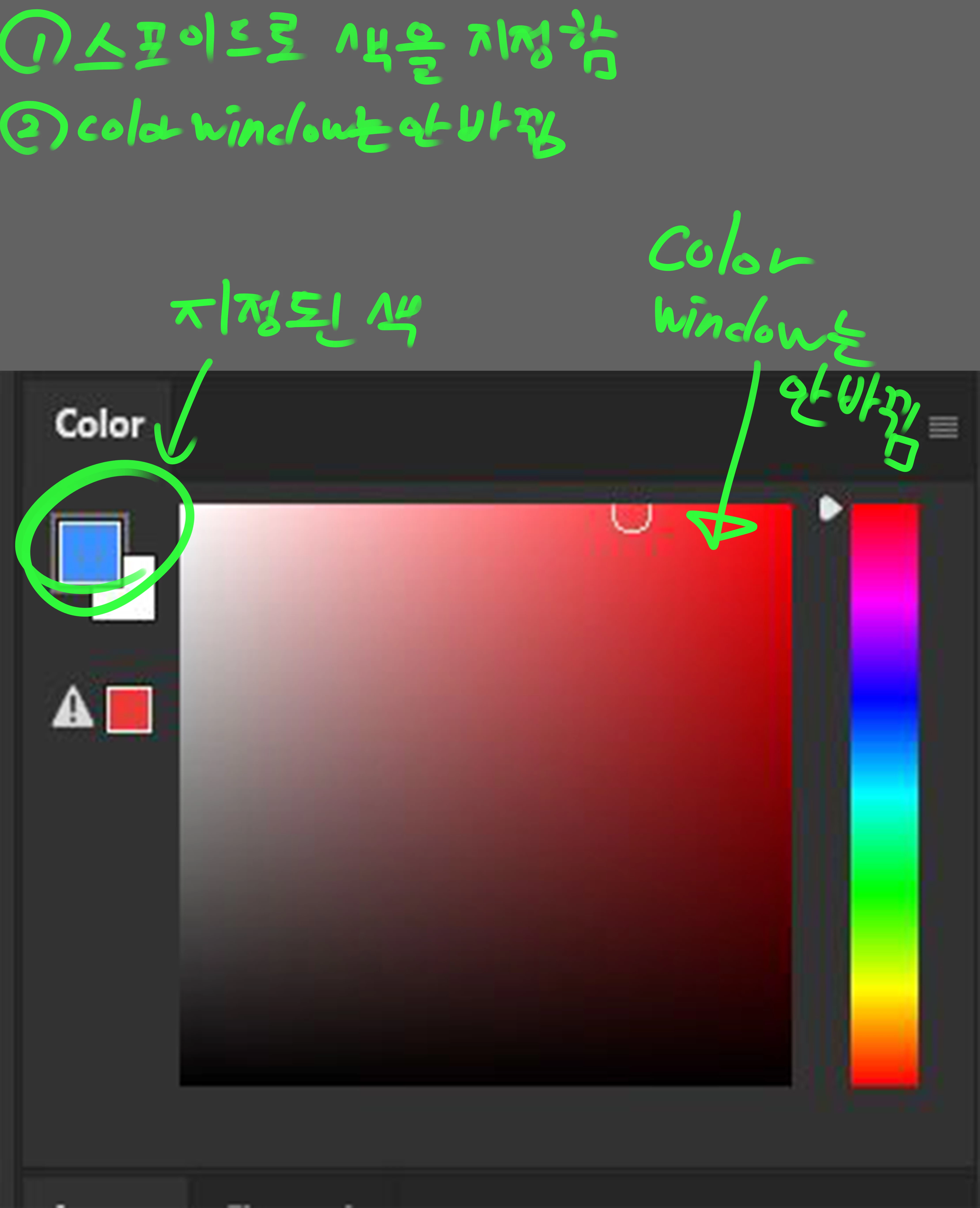 위에 사진처럼 컬리피커(스포이드)로 색을 복사하면 컬러 윈도우에는 바뀌지 않고 그냥 빨간 값을 유지해요 물론 색은 지정한 색이 나오긴 하지만 제가 지정한 색이 어느 위치인지 알 수 가 없어서  그림을 그릴 수가 없는 상황입니다 도와주세요..