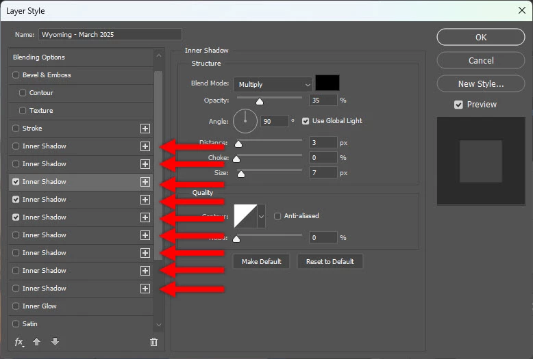 I opened Photoshop today and noticed the Inner Shadow option on the Layer style (under blending options) shows multiple of multiple instances!!! What the heck??? Not sure what happened and not sure how to fix. But...this looks like the beginning of something not good.