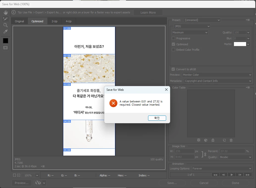 Hello, Im creating product detail pages and trying to save it by Save for Web.