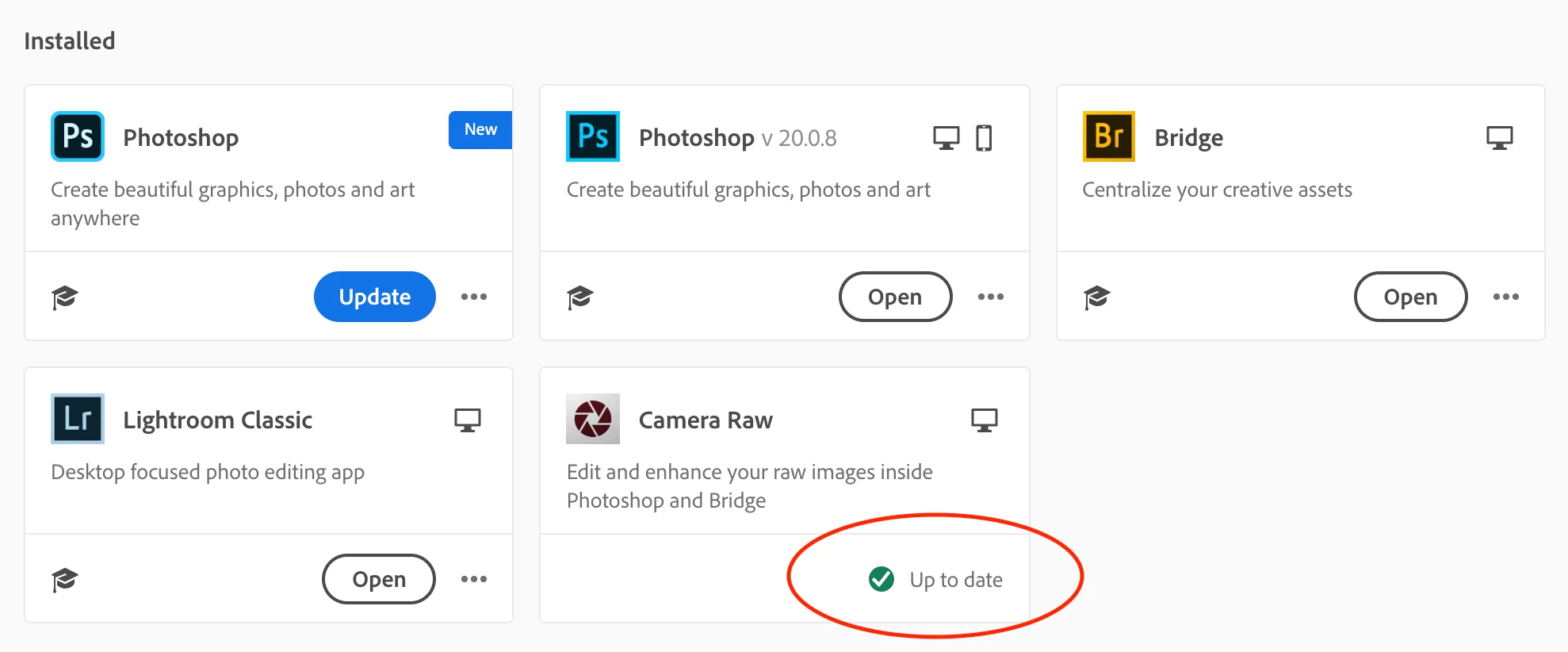 In the below, I've downgraded Photoshop to 20.0.8, but Lightroom Classic and Bridge are fully up to date. What you see here is that no update is offered for Camera Raw (and no dots menu to select a different version):
