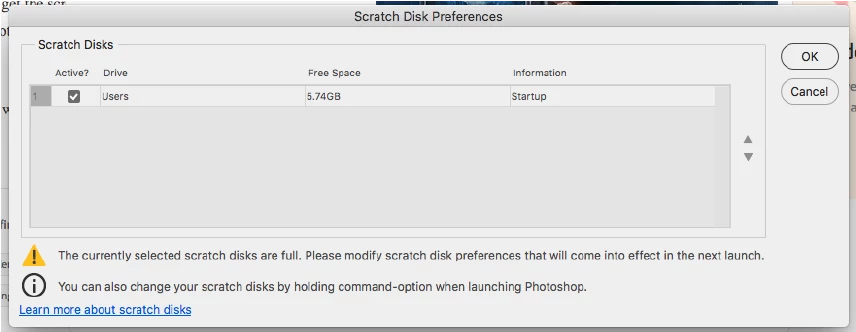 To correct the scratch disk, it says to select the command and option keys (mac) as I launch photoshop. I did, but I still get the scratch disk box, but it doesn't allow me to do anything with it. I uninstalled and reinstalled Photoshop, but still am in the same spot. I'm unable to open Photoshop to make any necessary adjustments.