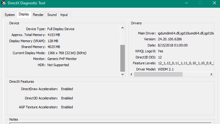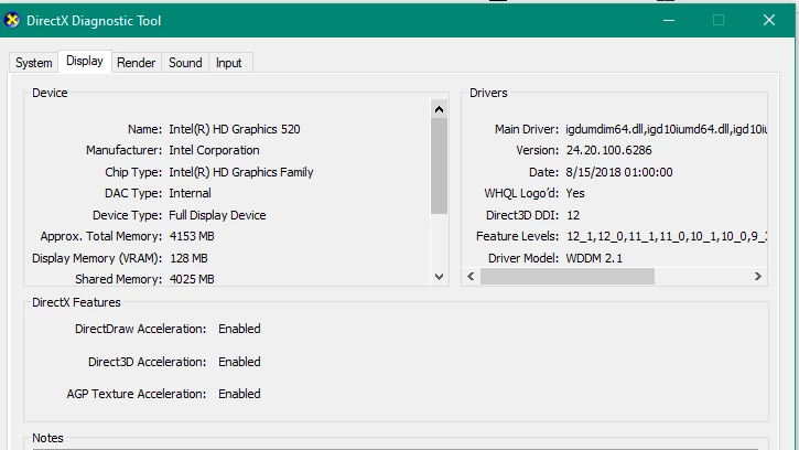 <gpuinfo availability="Running/Full Power" adapterCompatibility="Intel Corporation" adapterRAM="1024 MB" caption="Intel(R) HD Graphics 520" description="Intel(R) HD Graphics 520" driverDate="20180815000000.000000-000" driverVersion="24.20.100.6286" videoModeDescription="1366 x 768 x 4294967296 colors" pnpDeviceID="PCI\VEN_8086&DEV_1916&SUBSYS_380917AA&REV_07\3&11583659&1&10" installedDisplayDrivers="igd10iumd64.dll,igd12umd64.dll,igdumdim64.dll"/>
