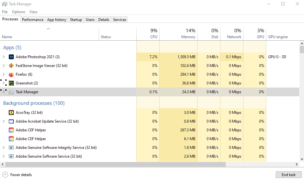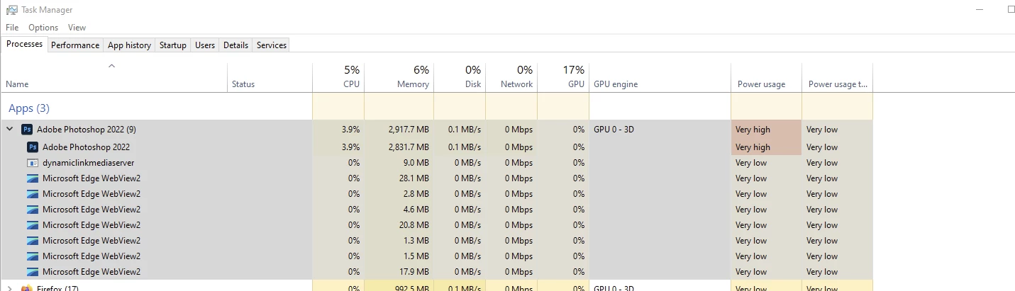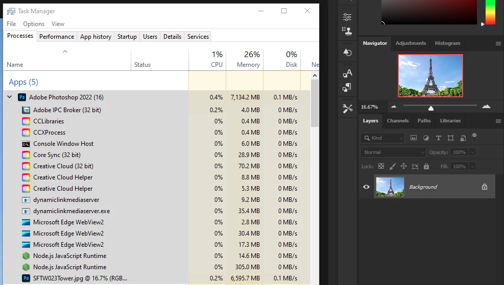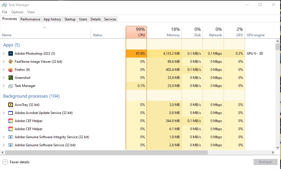 Just noticed that Photoshop version 23.5 the CPU usage is very high with just doing simple task, just one image opened and making levels adjustment and the CPU is @ 95.2 % also notice the difference in memory usage, 4GB of RAM for 2022