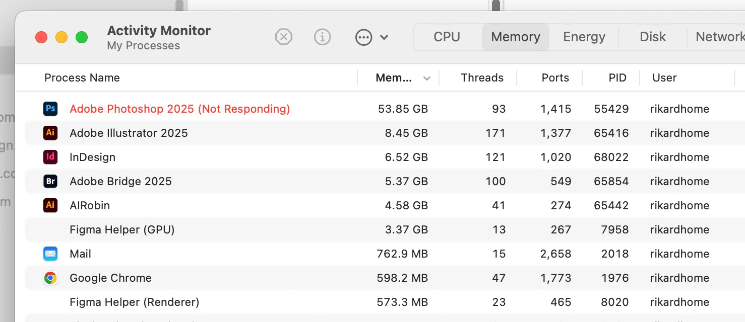 The latest version of Photoshop constantly freezes and also uses astronomical amounts of memory (yesterday it was 158GB), even when limits are set in the preferences. I basically can't leave the program open for more than an hour or two without the whole thing freezing up and requiring a force quit. I'm on a Mac Studio with 64GB of RAM running MacOS 15.5. My scratch disk is an SSD drive with a terabyte of space. I have tried resetting preferences, reinstalling the program, restarting my computer, changing the preferences and none of these solve the issue.