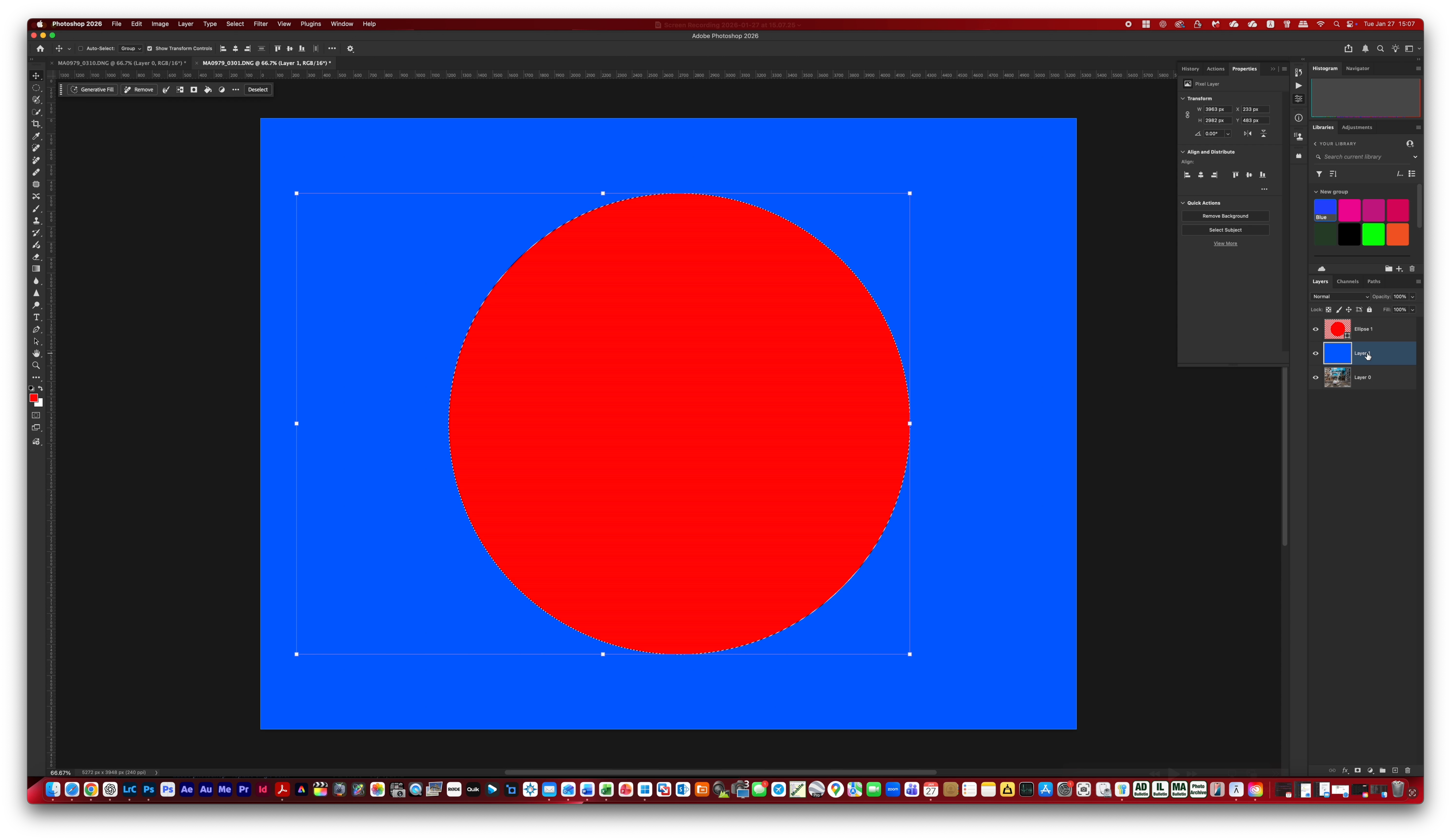 In Photoshop 26, something changed. When I switch layers, the bounding box changes to match the rectangular bounding box of the selection, not the circular selection itself. As a result: