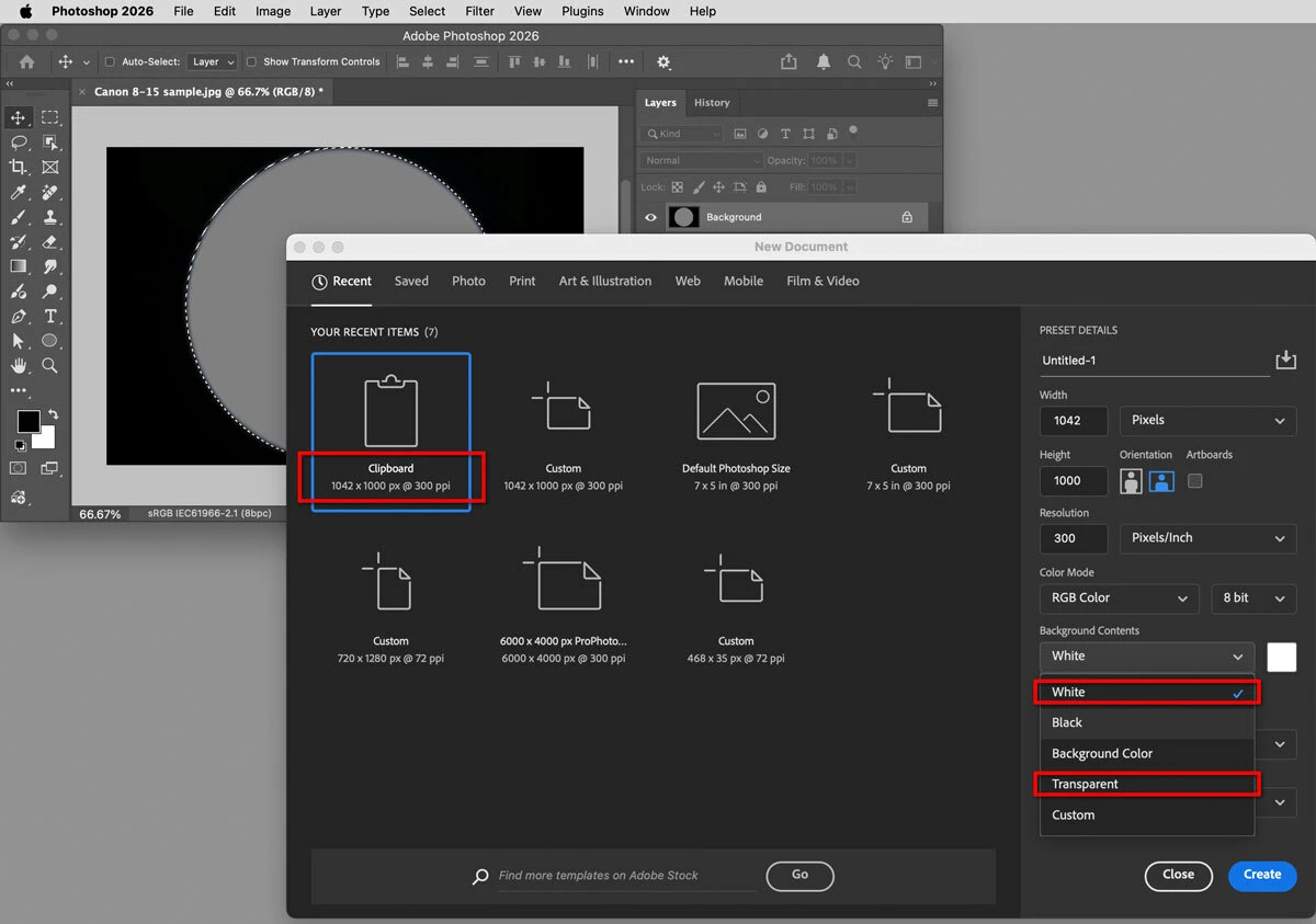 Up until now, Photoshop would create a new square canvas based on the clipboard, effectively preserving the full circular image in a square document.