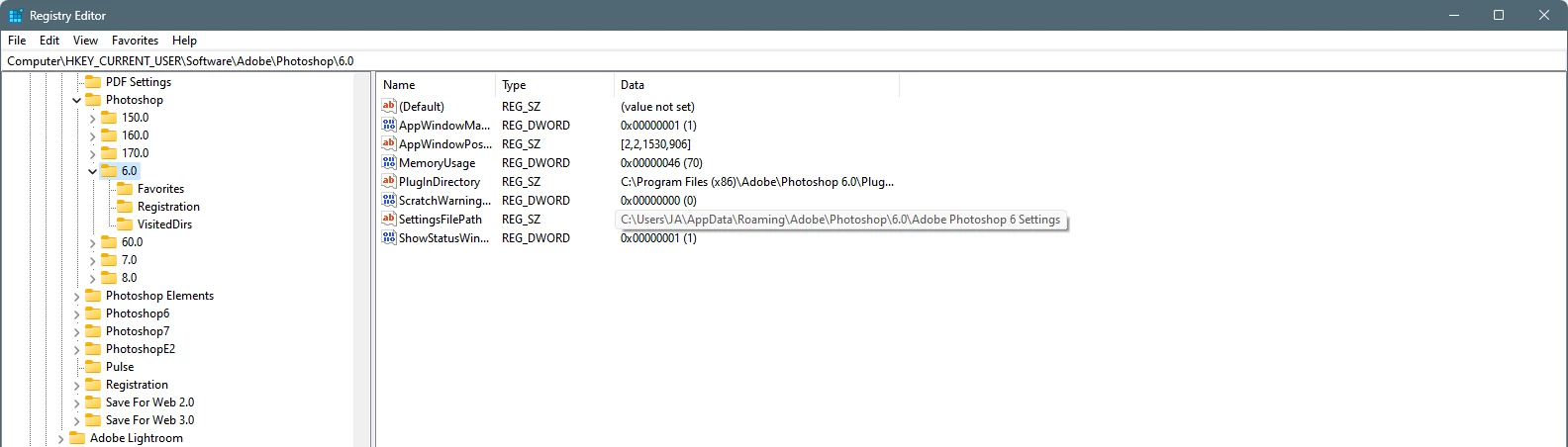 That's interesting about the SettingsFilePath in HKCU\SOFTWARE\Adobe\Photoshop\6.0