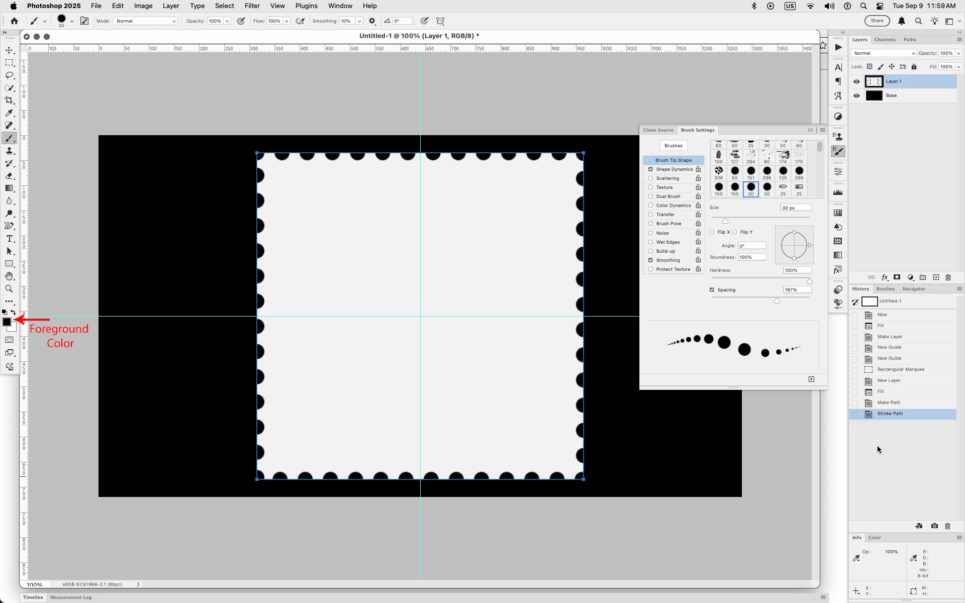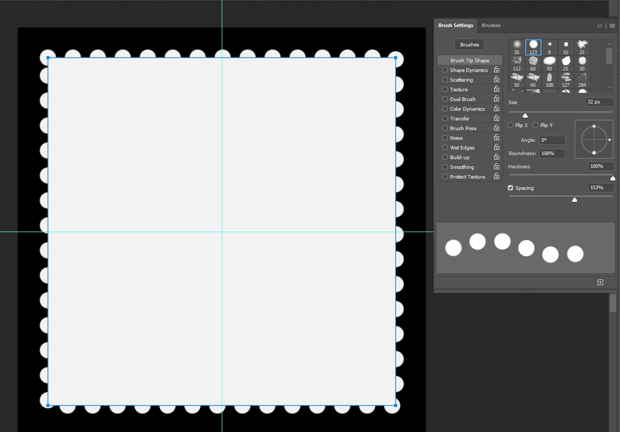 im working on creating a postage stamp is PS and one step calls for creating a work path then applying a circular brush to the path to get the perforated edge of a stamp. To achieve this the tutorial calls for making the work path, selecting the brush, then applying it and VOILA!! The effect. But.....the "brushes" in my brush menu (Win 11, F5) are all white and this effect seems to add to the work path (making the edge bulge out) instead of it subtracting from the edge.