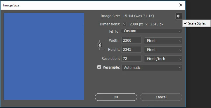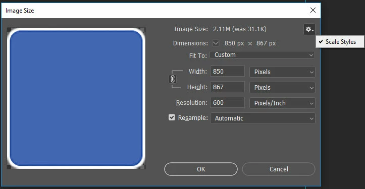 The stroke scales this time. I'm not hitting a stroke scale limit either. This second scale is bigger than the one above. In fact, I've found this behavior to be somewhat erratic. I can scale this box by changing the resolution up to about 400ppi and the stroke scales. But if I try a higher value, the stroke layer effect does not scale. I can however scale to 400ppi and then go to 600ppi and the stroke will scale both times as expected. (So a potential work around, but seemingly very strange behavior unless I'm not understanding something.)