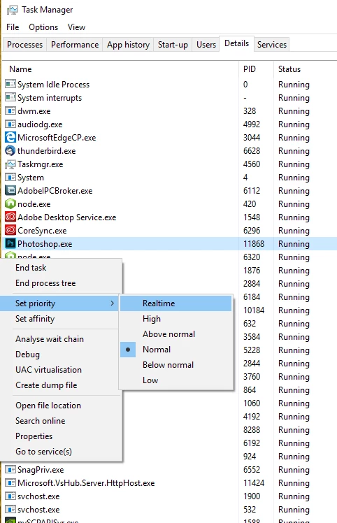 One more thing you could try Kevin is changing the priority of the photoshop.exe process. What this does is give Photoshop more processor time, so rather than sharing equally with all the other apps on the computer, Photoshop is given preference. For this reason this setting is not recommended when many apps are running in the background. With Task Manager the setting is not 'sticky', that is it needs to be set every time Photoshop is started. There are more advanced process managers that do remember these settings though. In Task Manager simply right click on Photoshop.exe, go to Set Priority and try High or Realtime.