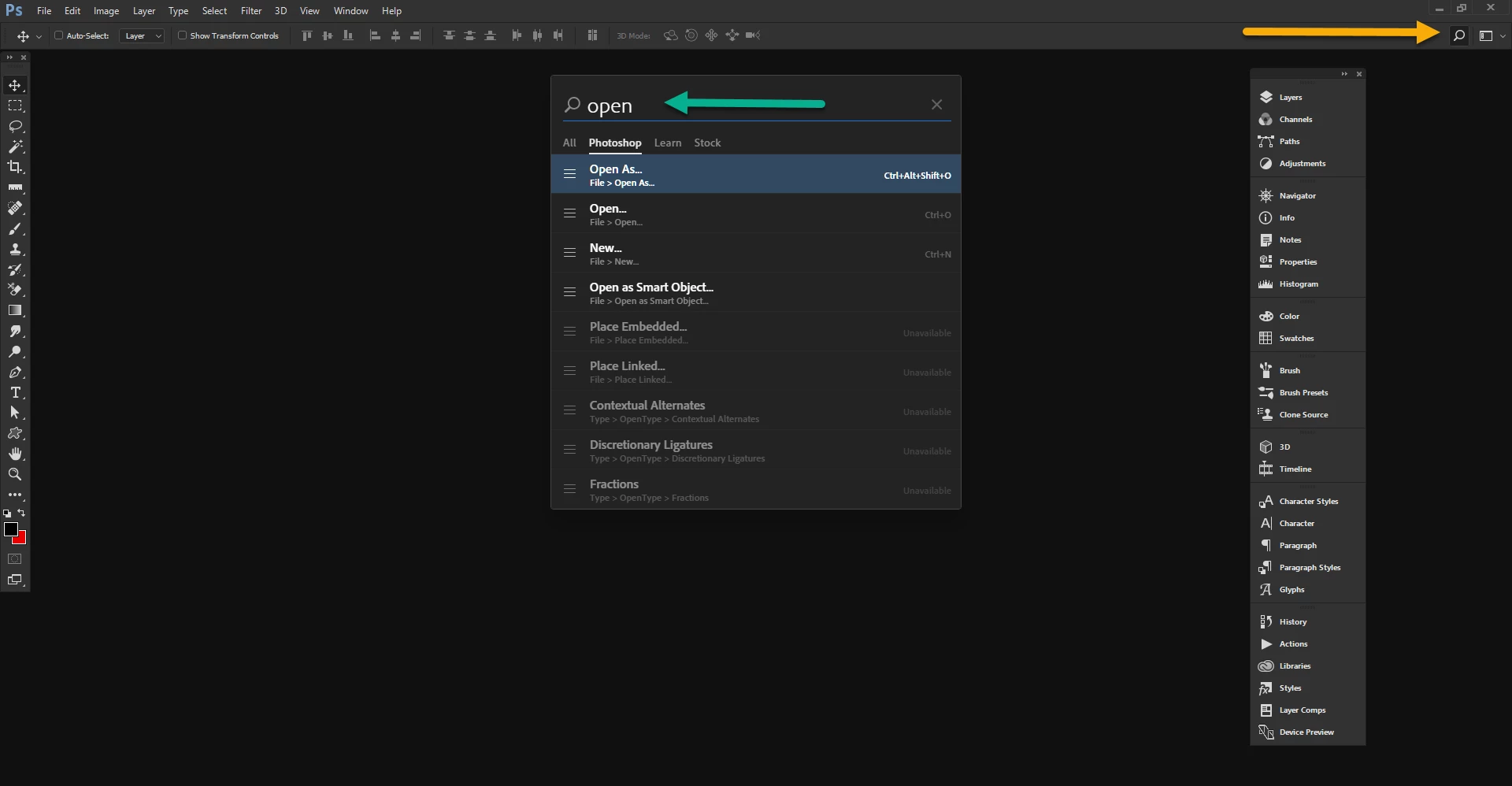 2) Use the 'Search' box to open a file (yellow arrow) Type in 'Open' (cyan arrow) and click on 'open'