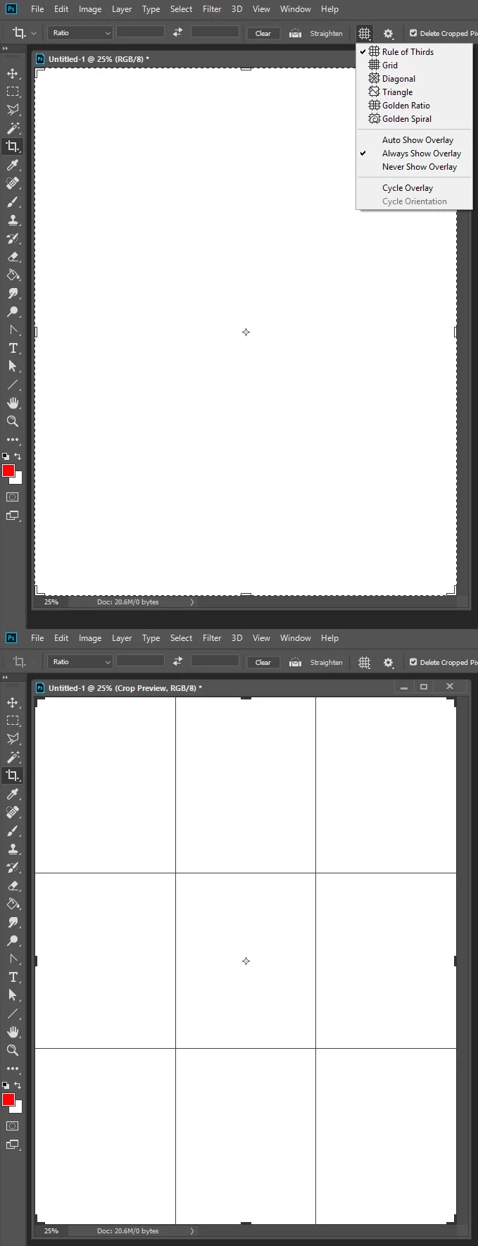 Old Photoshop had a crop tool to cut photo to equal 3rds. Is it not available on the new Photoshop CC 2018 ?