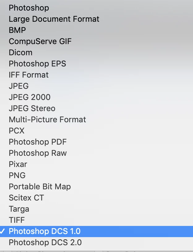 I try to save a file for a Riso print in DCS file format, but a don't find anymore this option on photoshop CC2019. Can anyone help me ?