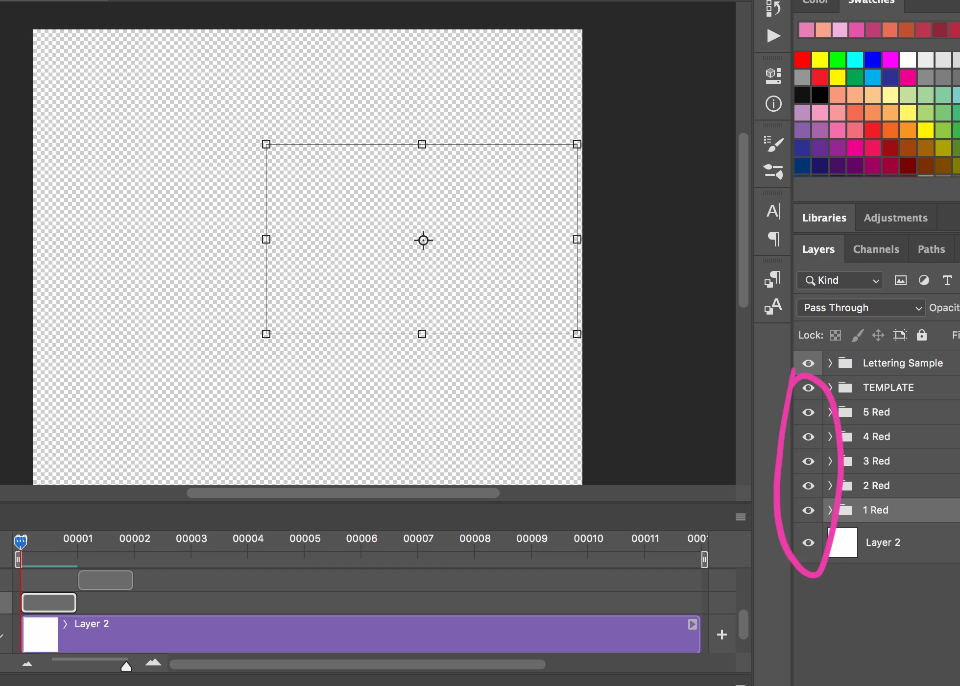 Hey all! I found a bug while animating in Photoshop CC using with the timeline panel. As you can see below in the screenshot, all my layers and groups are visible (the encircled eye icons), and the Transform tool can detect the contents of the "1 Red" group. However on the canvas everything shows up empty/ invisible.