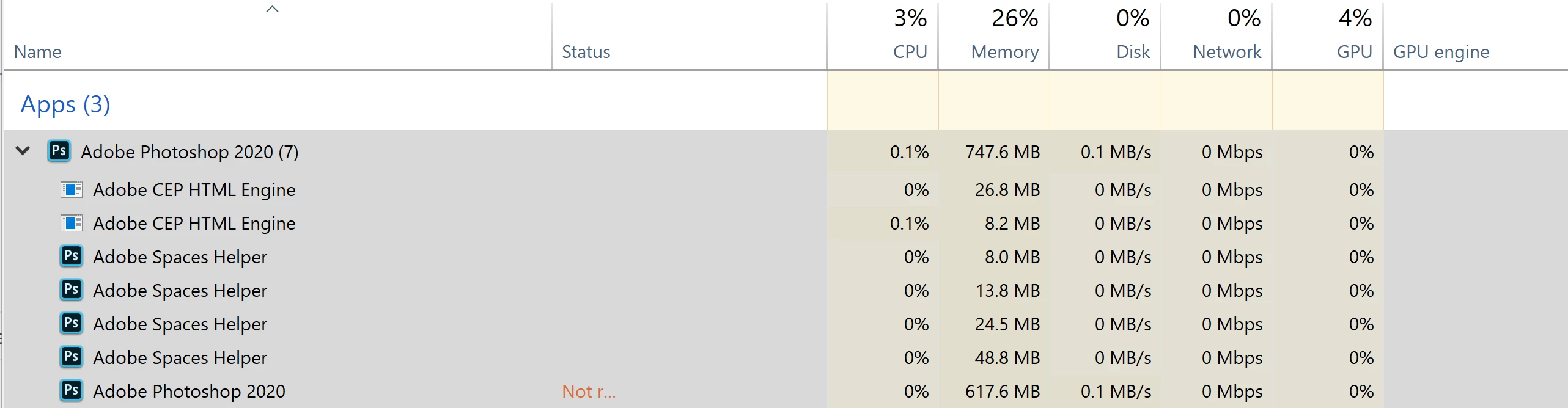 Whenever i switch program, i can't open Photoshop again. For it to close, i've got to go into the taskmanager and end the task. When i open the tasks, it says it's running 7 photoshop processes.
