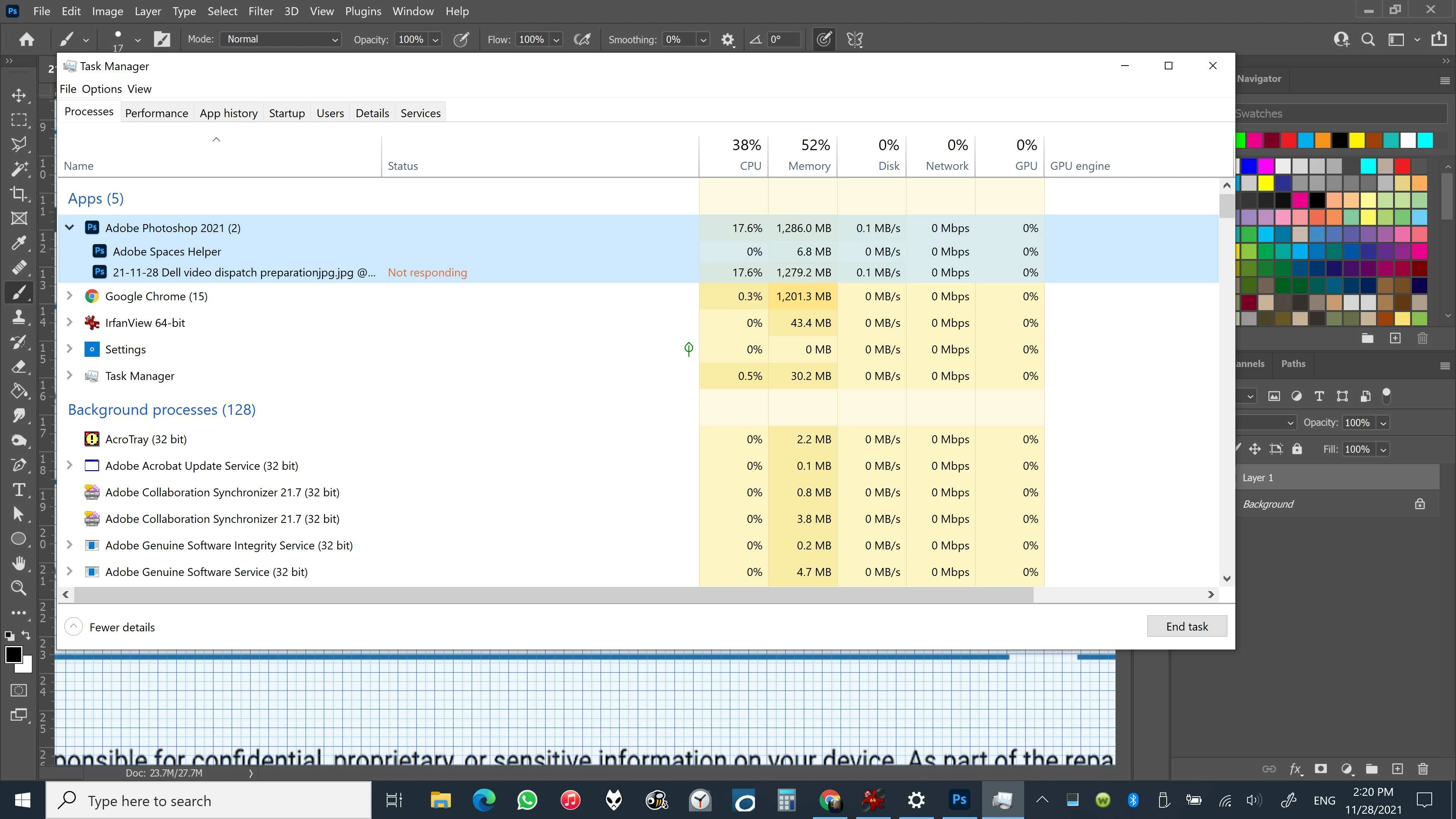 Photoshop crashes on my Dell 5520 Precision Laptop (Windows 10) - There's a conflict with the GPU (NVIDIA Quadro M1200). Dell support ran various diagnostics; all came back fine. I have updated all drivers and to the latest Photoshop version.