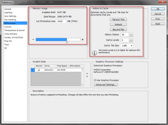 GPU is not at maximum when I run Photoshop and there is plenty of free space on the HDD.