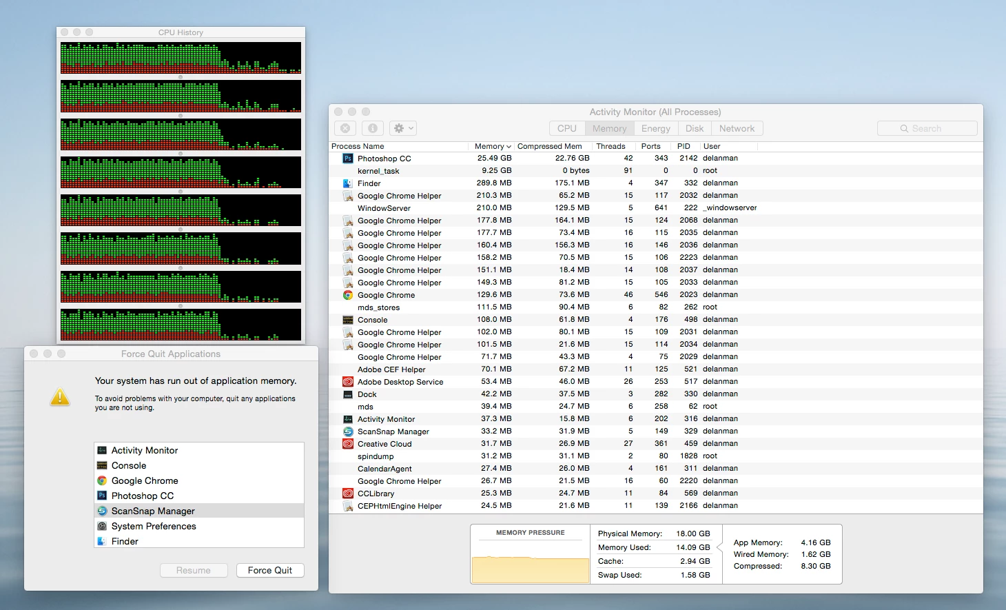 I have a iMac 27-inch, Late 2013, with 3.4 GHz Intel Core i5, and 8 GB 1600 MHz DDR3 of memory, running Yosemite 10.10.4. All I have run, at the same time, are: Adobe Photoshop and Bridge, and Safari, running a Flash Player video.