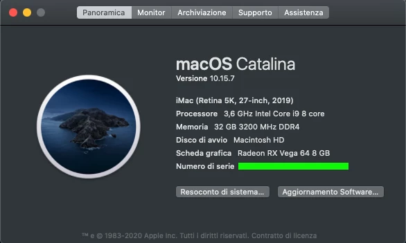 My mac is an i9 with 32gb RAM, 500gb ssd and radeon 64 8gb.