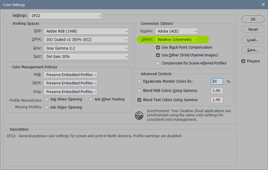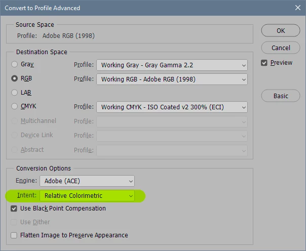 Question: If I update my Color Settings in Photoshop, then I immediately follow it up with "Edit » Convert to Profile…” is this dialog box supposed to pick up the Conversion Options (i.e. Rendering Intent), that was applied in the Color Settings? If it is, Photoshop appears to be buggy/inconsistent in this regard...