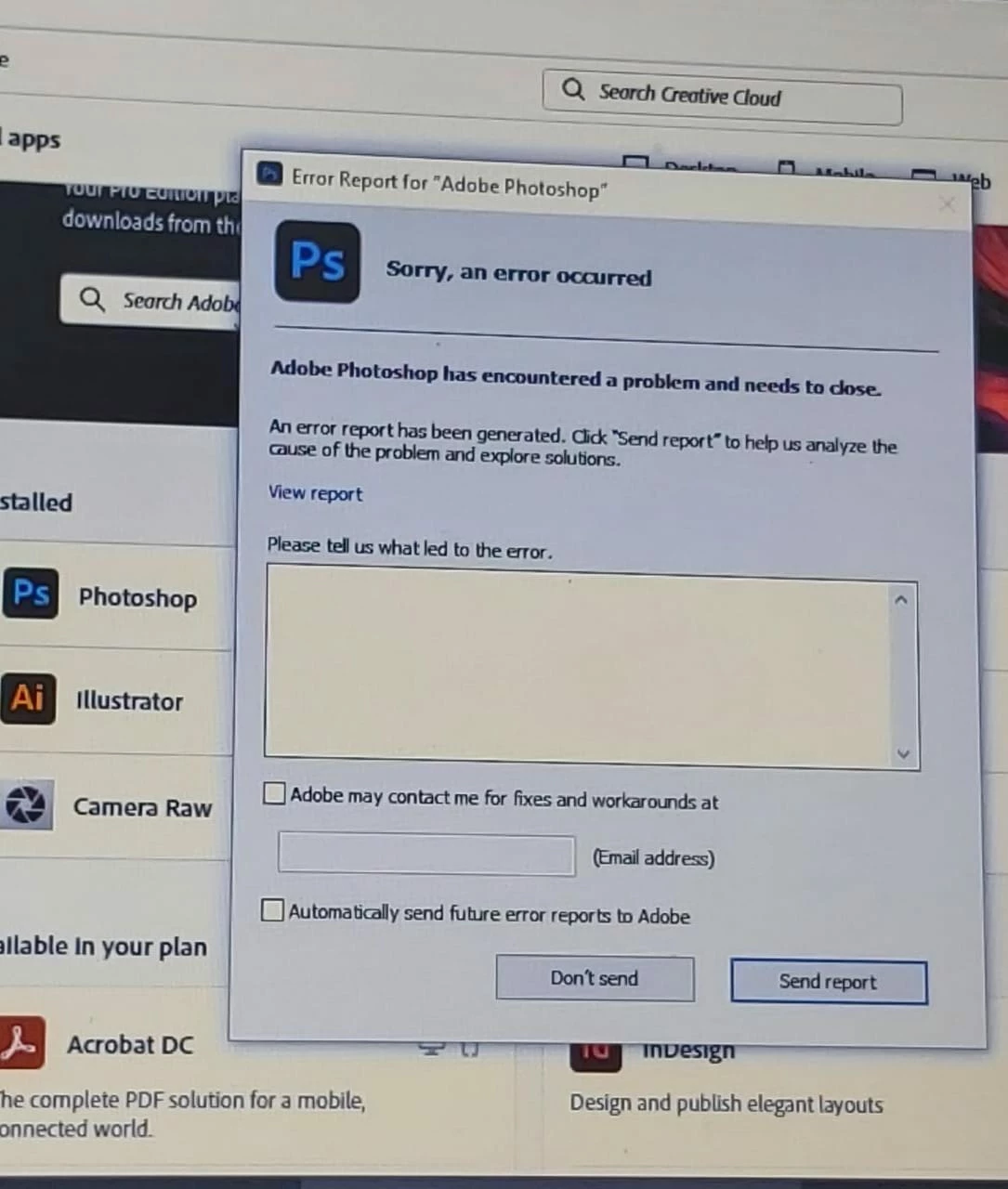 Hello Adobe Support i am facing a problem using Photoshop A window appears saying Sorry <an error occurred> Is there a solution for that !