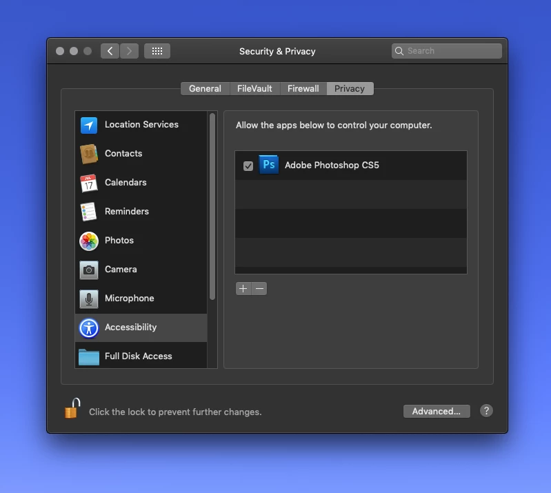 3. Tick the box in front of „Adobe Photoshop CS5“ in the list of “Allow the apps below to control your computer”.