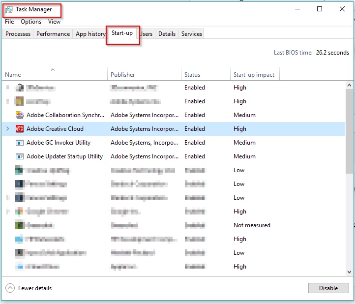 As of a few days ago, Photoshop CS6 began to launch itself automatically during computer startup on Windows 10. There is no image document loaded. I've tried purging the recovery file cache, disabling all Adobe startup apps I could identify in the Startup section of Task Manager (including AdobeAAManager, Bridge, etc.), minimizing CS6 before closing the program, and even disabling Windows 10 Quick Start (which remembers and restores all open windows on the next reboot). I've run CCCleaner, SuperAntiSpyware, Malwarebytes, etc. Nothing works. Photoshop CS6 keeps popping up at startup, and it has become a real annoyance. Does anyone have any ideas?