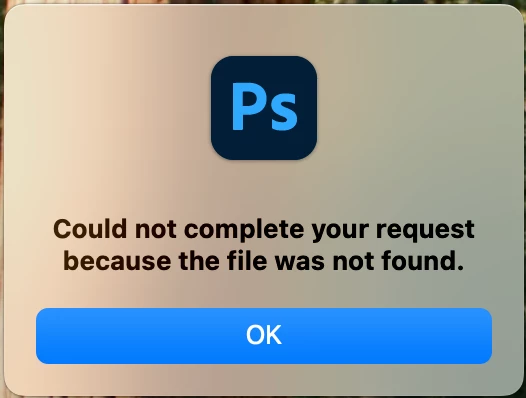 Now Photoshop does not open; even when clicking directly on the main application icon (as opposed to the icon in the dock). I get the message: Could not complete your request because the file was not found. I tried moving the settings to the desktop so that new settings would be created, but that made no difference.