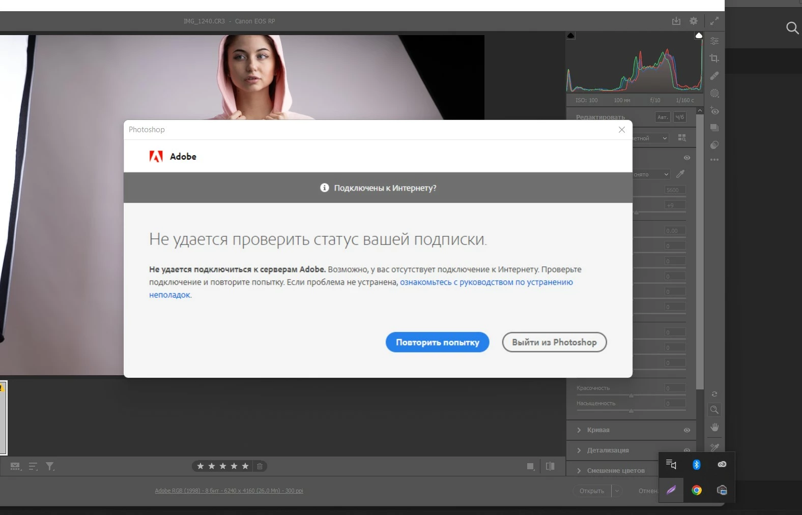 Hello. I have problems with the work of photoshop, it does not work without the Internet. I live in Ukraine and there is no light and communication for 2 days. Please tell me how to solve the problem.Even if I logged in with the Internet, the authorization passed on reboot again does not work.