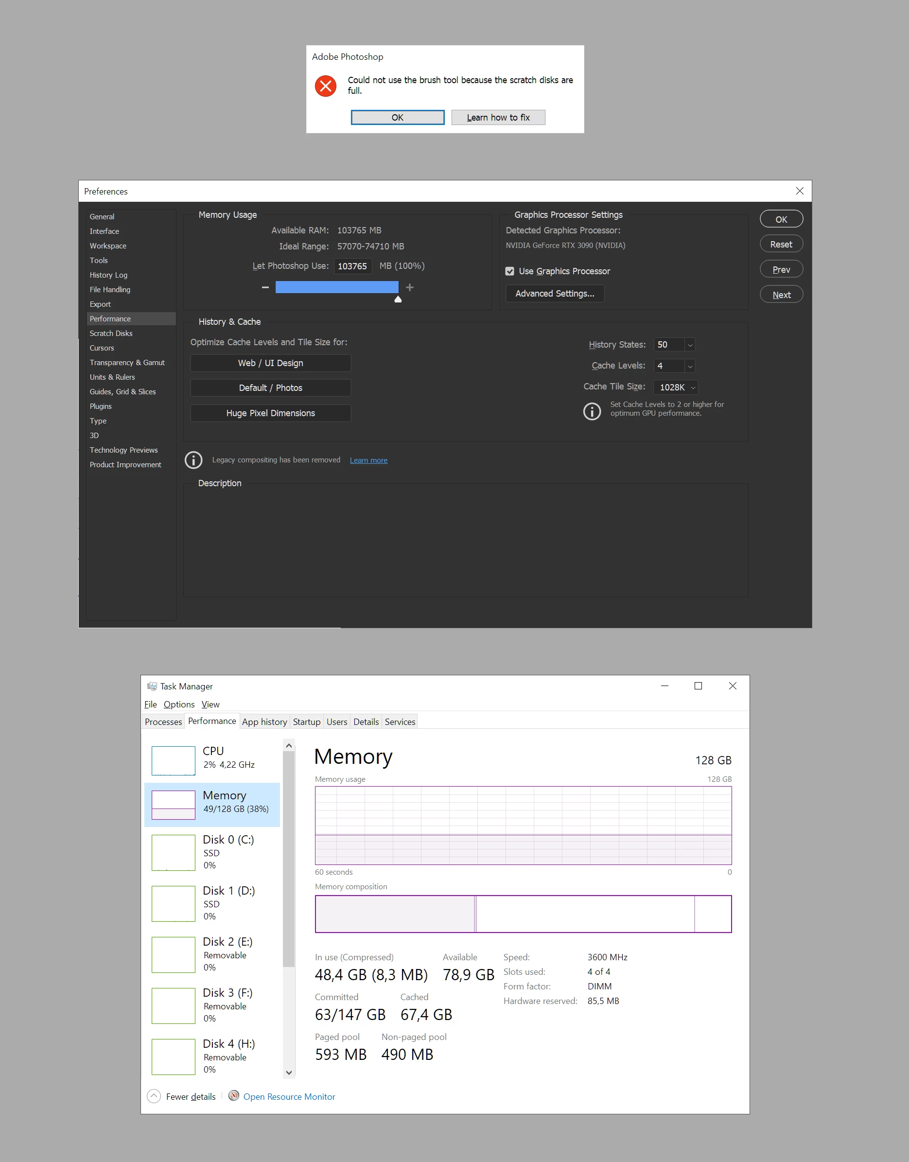 I'm letting Photoshop use 100% of the available RAM as of the picture below.