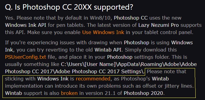 We generally recomment the Windows Ink API with recent Photoshop versions, but if Wintab is working for you, go with that.  This comes from the Lazy Nezumi Pro FAQ