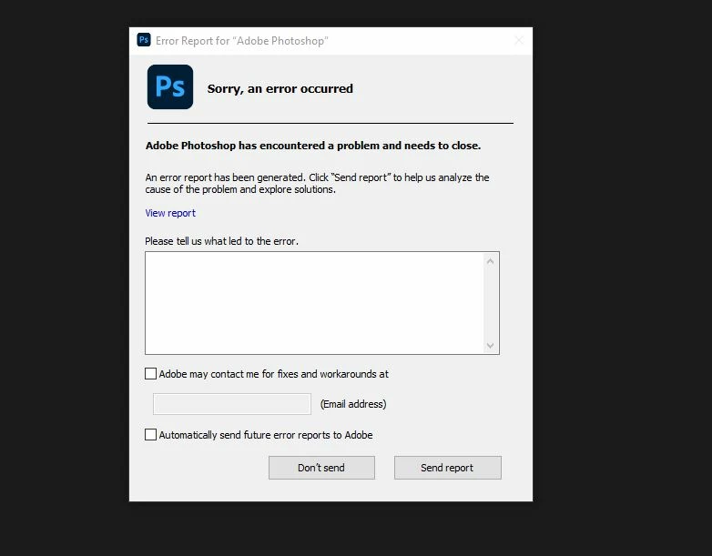 Did you use the View Report blue link and capture the report. I think only Adobe  has the tools and the source code  that is needed to be able to see what failed. Sorry an error occurred is not helpful. From the report  you man be able see the name of the Photoshop module that failed.