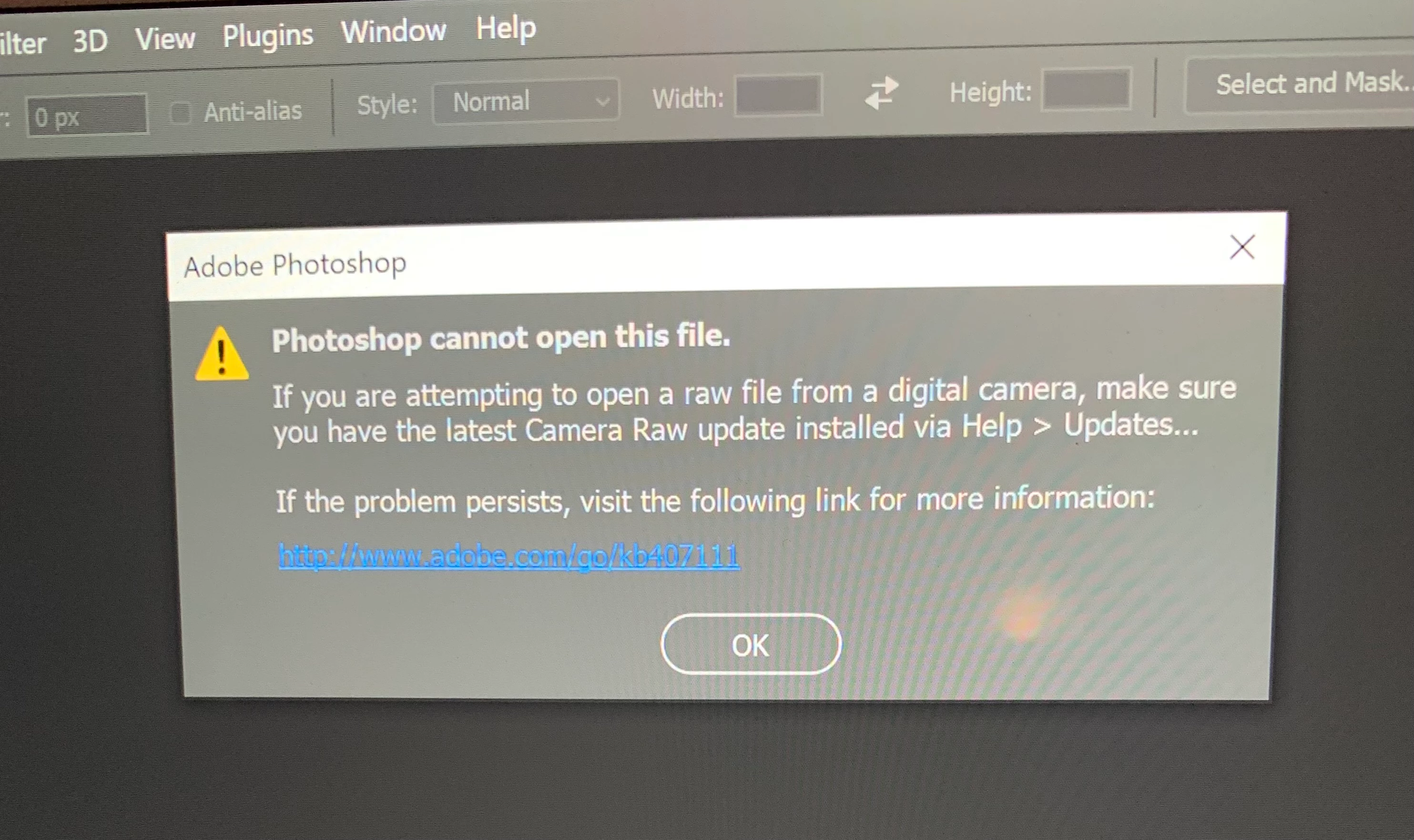 Recently on some of my images when opening from bridge into photoshop, I get this error message (See attached image) and clicking on the link is giving me no good answers. Looked at the Camera Raw preferences for handling raw files thinking that was the problem. However, it would not allow me to change to 'Camera settings' and/or 'add Camera info' .What does this error message mean? How do I fix it? Thank you